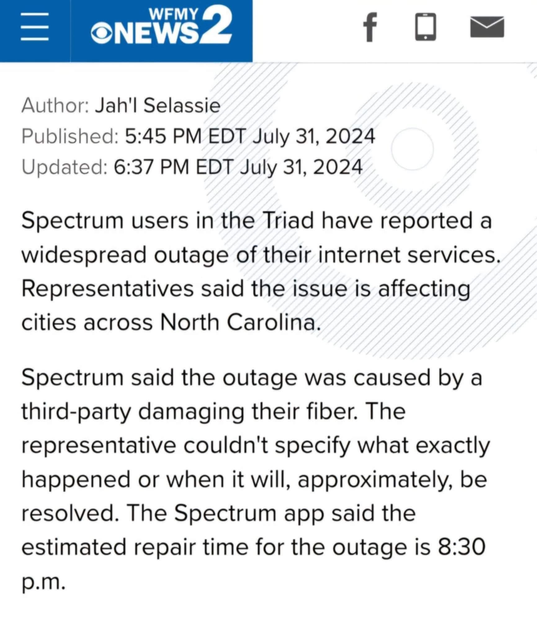 Har Lumos fiber i High Point och mitt är fortfarande online, men mina svärföräldrar i GSO med Spectrum är nere.