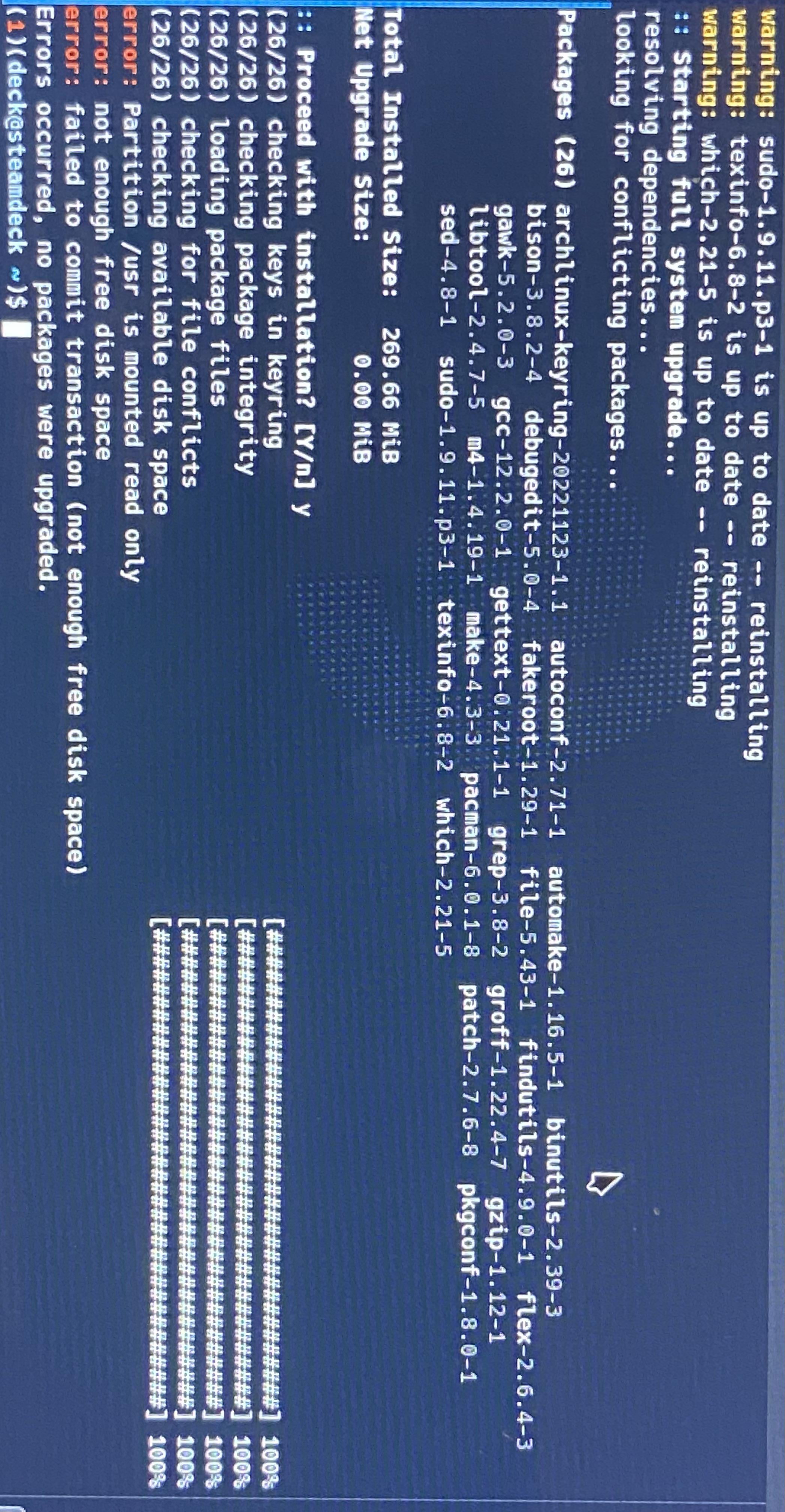 **Hoppa över detta avsnitt och fortsätt till nästa kommando om du inte stött på några fel från base-devel-kommandot. Annars fortsätt läsa detta avsnitt: Om Linux ger följande fel: Dela /usr är monterad som läs-och-skriv fel: Inte tillräckligt med ledigt diskutrymme fel: Misslyckades med att fullfölja transaktionen (inte tillräckligt med diskkapacitet), skriv följande kommando för att gå vidare: Sudo systemd-sysext unmerge och när du har slutfört resten av guiden, skriv följande kommando (Inte nu): sudo systemd-sysext merge. Jag kommer att påminna dig igen i slutet av guiden att avbryta unmerge.